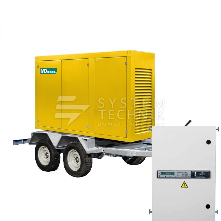 - MitsuDiesel МД ЭД-150-Т400-2РПМ29 в погодозащитном кожухе на шасси с АВР на прицепе
